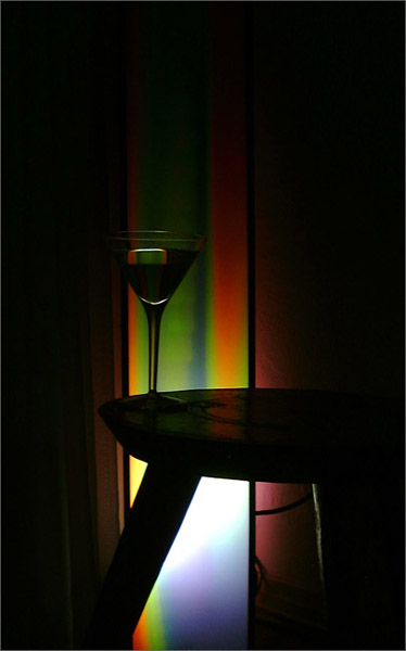 A wooden edge supports light images on both sides. 4' tall, 8" wide.