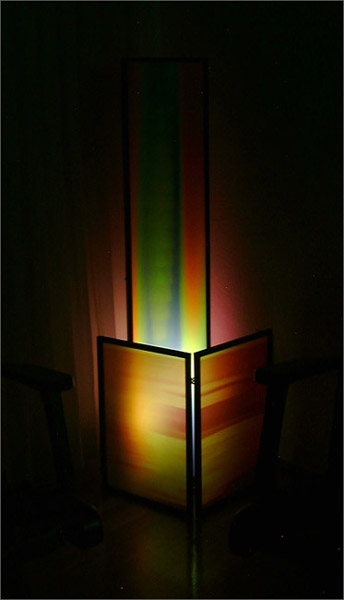 A wooden edge supports light images on both sides. 4' tall, 8" wide.