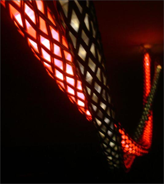 Braided stainless steel fibres wrap, protect, and provide a functional and aesthetic armature for the glowing, colored polycarbonate inner core. It can easily be hung from either end or both ends. 6ft long, 2" diameter.