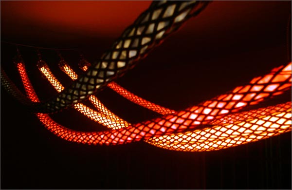 Braided stainless steel fibres wrap, protect, and provide a functional and aesthetic armature for the glowing, colored polycarbonate inner core. It can easily be hung from either end or both ends. 6ft long, 2" diameter.