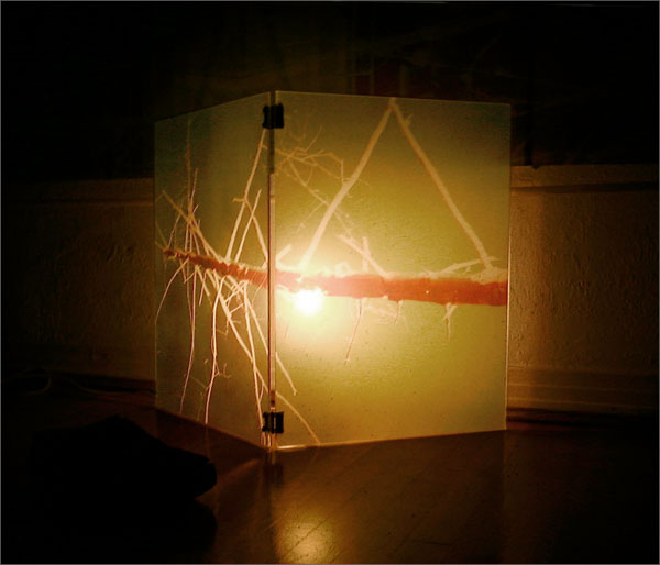 A seamless structure/image made of acrylic/polycarbonate, with complimentary steel hardware. Like the multi-floor lamp, it can be oriented vertically or horizonntally. 24" tall, 36" wide when fully opened.