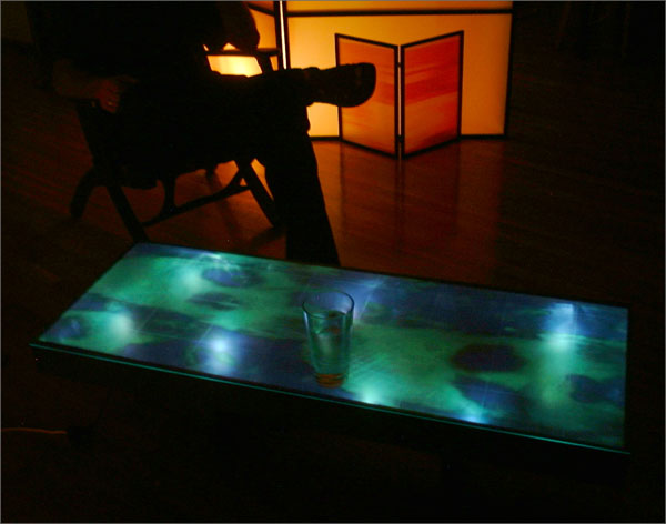 More than the others, the pictures don't do this prototype justice. Ambient room lighting and a table in one piece. Object on this table are in an eerie psuedo-silhouette. Great if you're looking for minimal lighting in a room, yet still be able to see your drink, phone, etc..